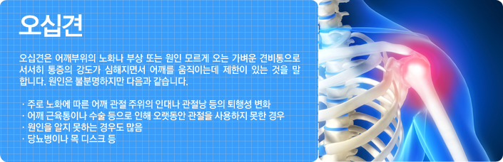오십견은 어깨부위의 노화나 부상 또는 원인 모르게 오는 가벼운 견비통으로 서서히 통증의 강도가 심해지면서 어깨를 움직이는데 제한이 있는 것을 말합니다. 원인은 불분명하지만 다음과 같습니다.
