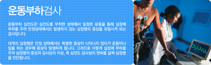 운동부하 심전도 검사는 위험도가 낮은 검사이며 협심증과 부정맥의 진단에 매우 중요한 정보를 제공하여 줍니다.