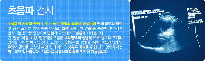 초음파란 사람이 들을 수 없는 높은 영역의 음파를 이용하여 인체 내부의 혈관 및 장기 모양을 확인 하는 검사로, 초음파(음파의 일종)를 몸안에 투과시켜 반사되는 음파를 영상으로 변환하여 모니터나 필름에 나타냅니다. 간, 담낭, 췌장, 비장, 혈관계를 포함한 내과영역의 질병의 유무, 병소의 크기와 양상을 진단하며 전립선과 고환의 이상유무를 감별을 위한 비뇨생식기계, 유방과 골반을 포함한 부인과, 태아의 이상유무 감별을 위한 산과 영역에서는 필수적인 검사입니다. 초음파를 사용하여 다음의 진단이 가능합니다.
