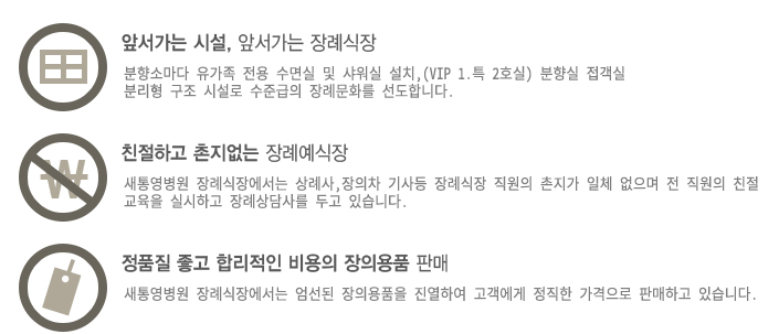 저희 새통영병원 장례식장은 올바른 장례문화를 선도하고 유가족과 슬픔을 함께하는 마음으로 정성을 다해 편안한 장소를 제공하는데 최선을 다하겠습니다. 최고의 시설과 품격있는 서비스로 새로운 장례문화를 이끌어 가겠습니다.
